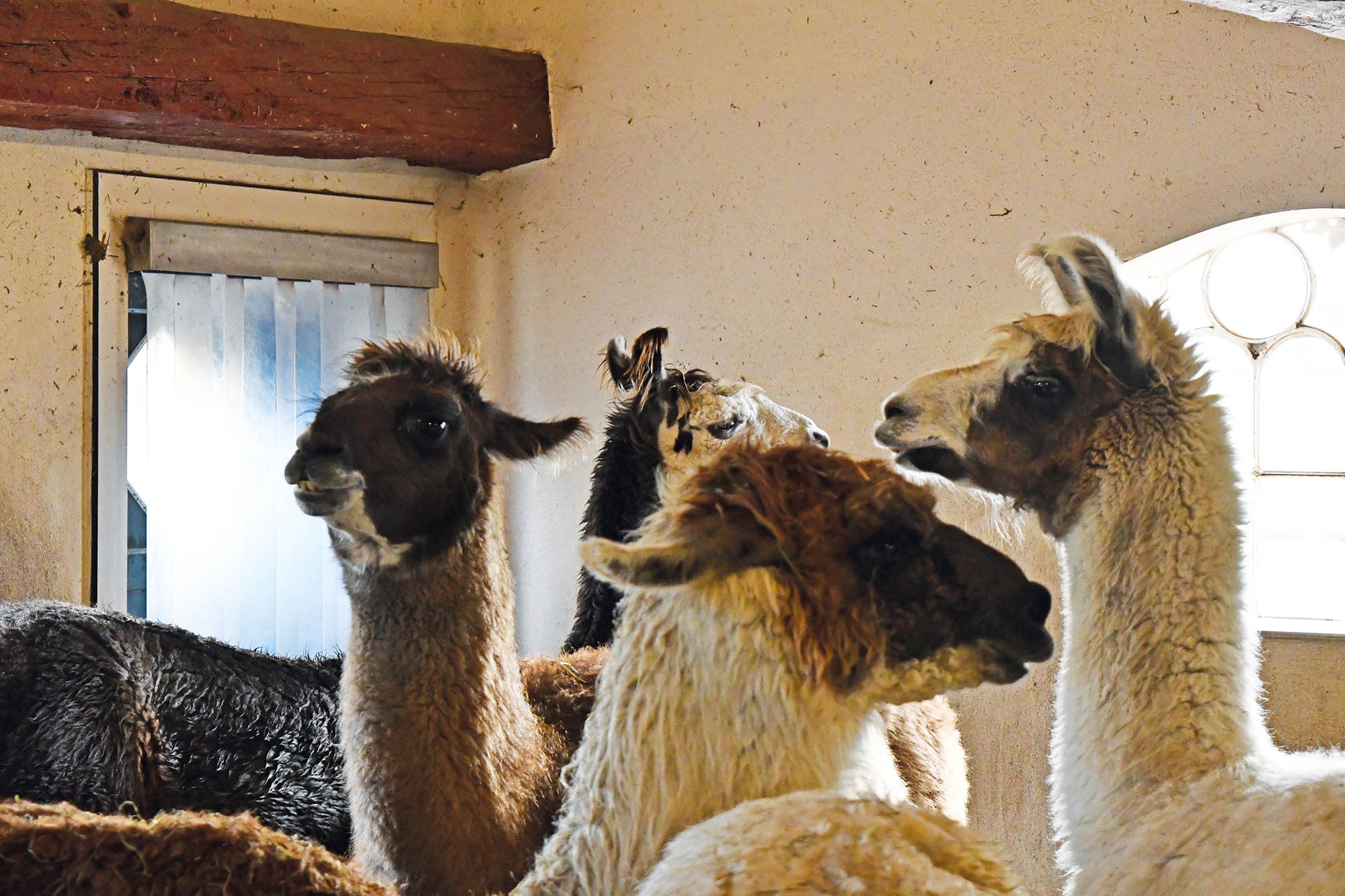 Auf dem „Zottelhof“ in Thaden bei Hanerau-Hademarschen begrüßt uns Monika Bartels und führt uns auch gleich in den Stall, damit wir die Lamas und Alpakas und die Tiere uns kennen-