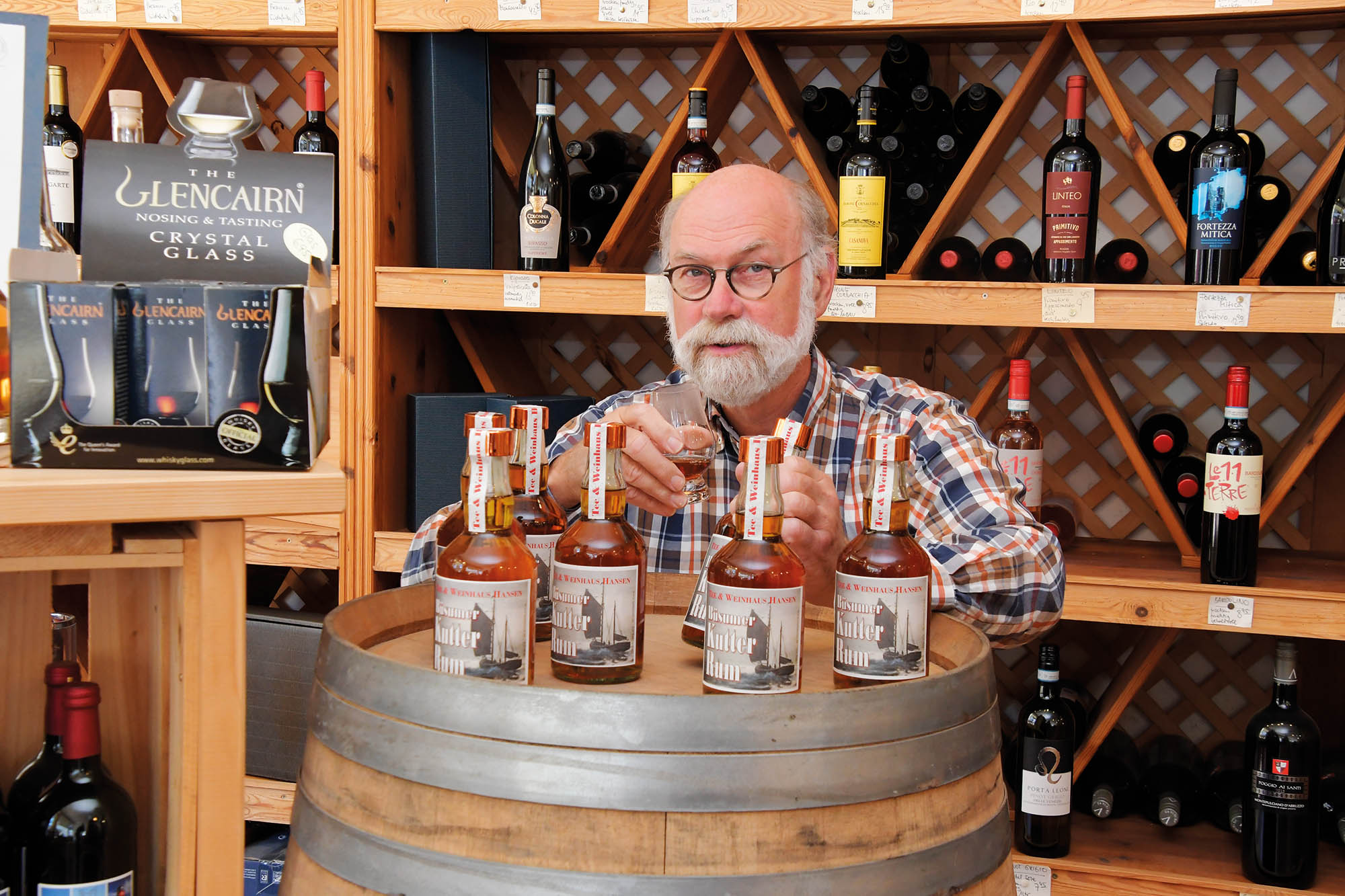 Inzwischen hat die hauseigene Rumkomposition einen großen Kreis von Liebhabern gefunden (übrigens nach „Unser Rum“, eine eher exotisch-fruchtbetonte Blendung, die zweite Rum-Eigenkreation). Der Rum passt auch wunderbar zu einer kräftigen Mischung friesischen Tees, im Glas anbei oder als kleiner Schuss (Teelöffel reicht, um nicht den Geschmack des Tees zu übertünchen) hinein.