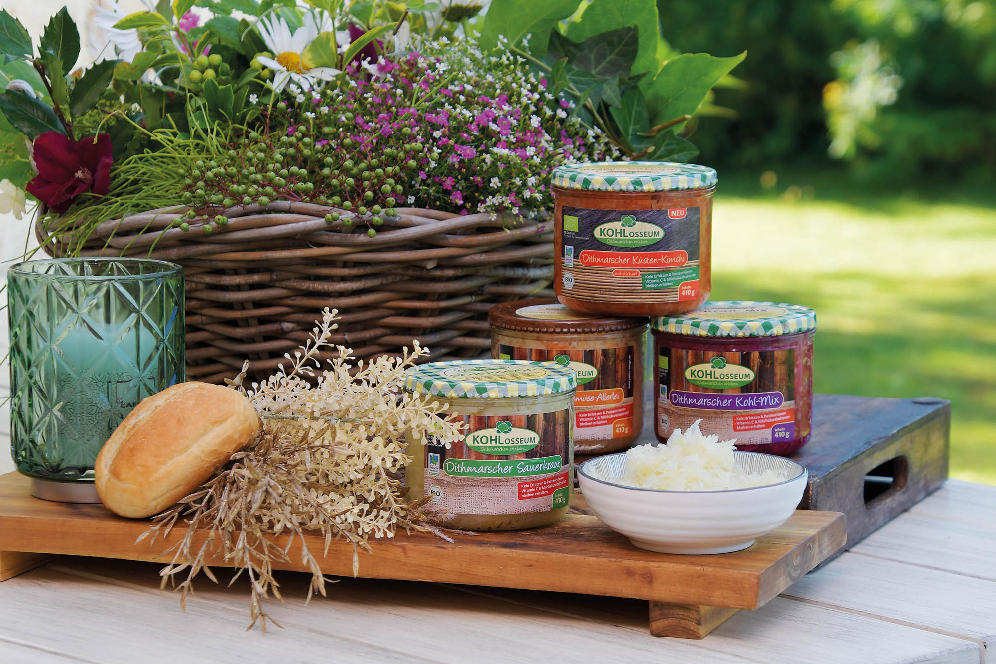 Die Krautherstellung im Kohlosseum zeichnet sich durch sein patentiertes schonendes Gärverfahren aus, das vom Krautmeister Hubert Nickels entwickelt wurde. Bio-Kohl, mehr Zeit zum Wachsen und Spezialgläser, in denen der Kohl vergoren wird, sind das Geheimnis. Dadurch bleiben im Gegensatz zum erhitzten Dosensauerkraut Vitamin C und Milchsäurebakterien erhalten. Das gärfrische Sauerkraut ist bekömmlicher und gesünder als das handelsübliche pasteurisierte Kraut. Dithmarscher Kohl-Mix, das Gemüse-Allerlei und der Dithmarscher Küsten-Kimchi sind weitere leckere Produkte aus der Krautwerkstatt. Wie das ganz genau funktioniert erfährst du bei einer Vorführung inklusive Verkostung.
