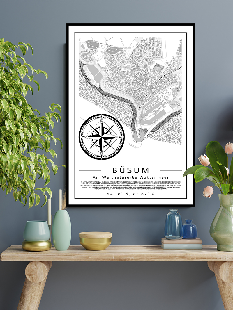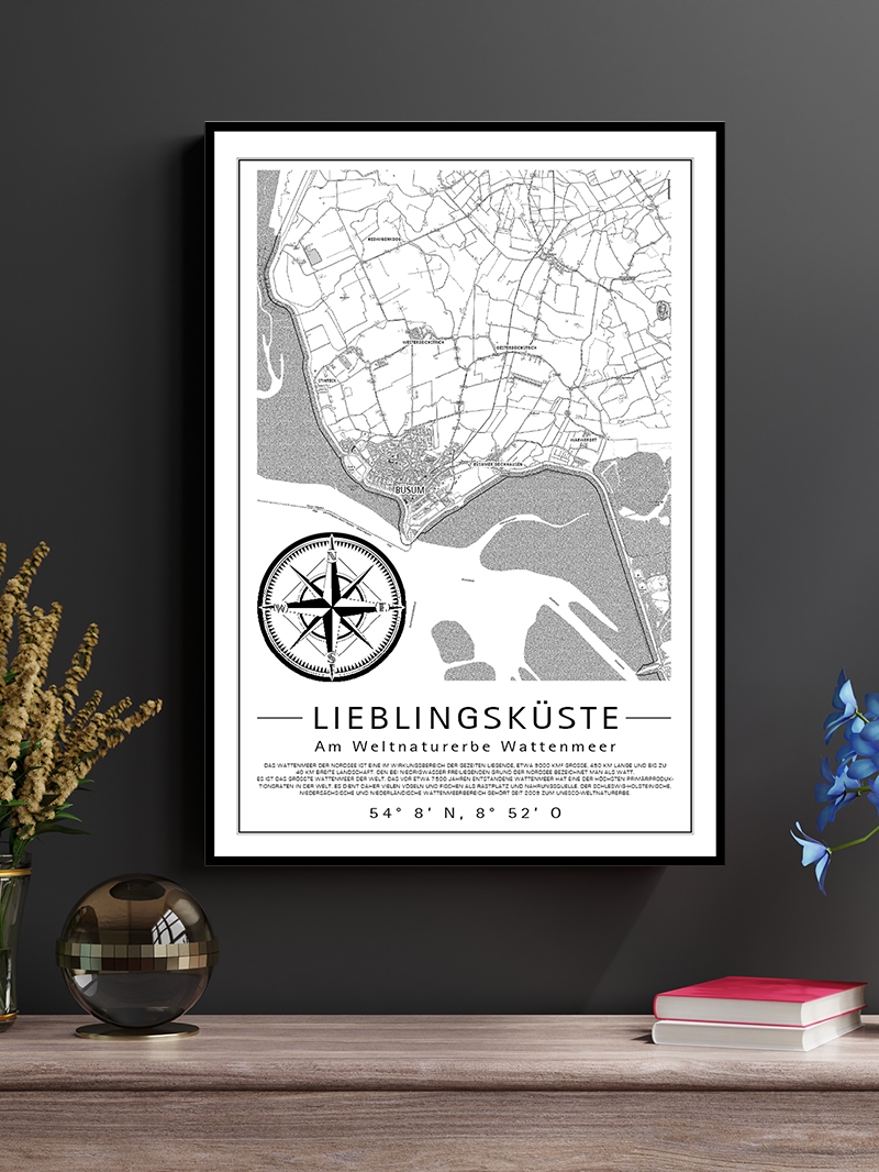 Die Büsumer Firma Wipsteert hat ihr Angebot rund um die Marke LIEBLINGSKÜSTE® erweitert. Der neue Online-Shop hat jetzt neben den beliebten Motiven von Büsum auch Citymap-Bilder von Orten wie Hamburg, St. Peter-Ording, Friedrichskoog, Sylt u.v.m. Jedes Motiv gibt es hochwertig gedruckt auf Aluminiumplatte in den Formaten 70 x 100 cm und DIN A2 oder als preisgünstiges Poster auf 250 g Papier. Wandaufhängung optional gleich mit dabei.