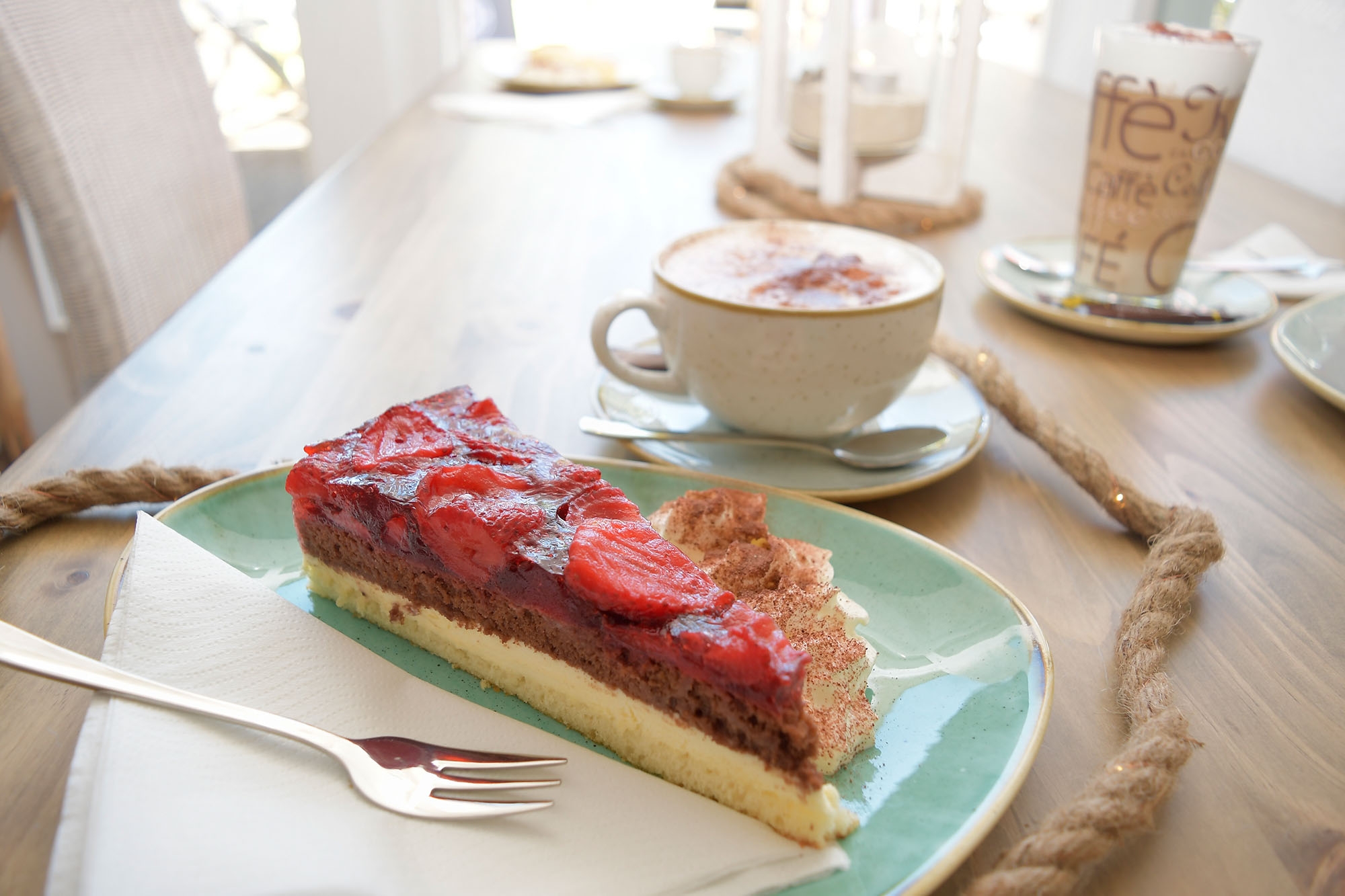 Die große Terrasse vor dem Lokal sowie die im Shabby-Chic eingerichteten Innenräume laden zu einem gemütlichen Päuschen mit erfrischenden Getränken, Kaffeespezialitäten und Kuchen ein.