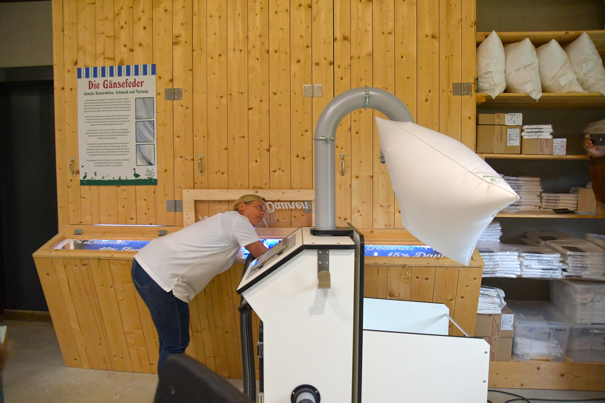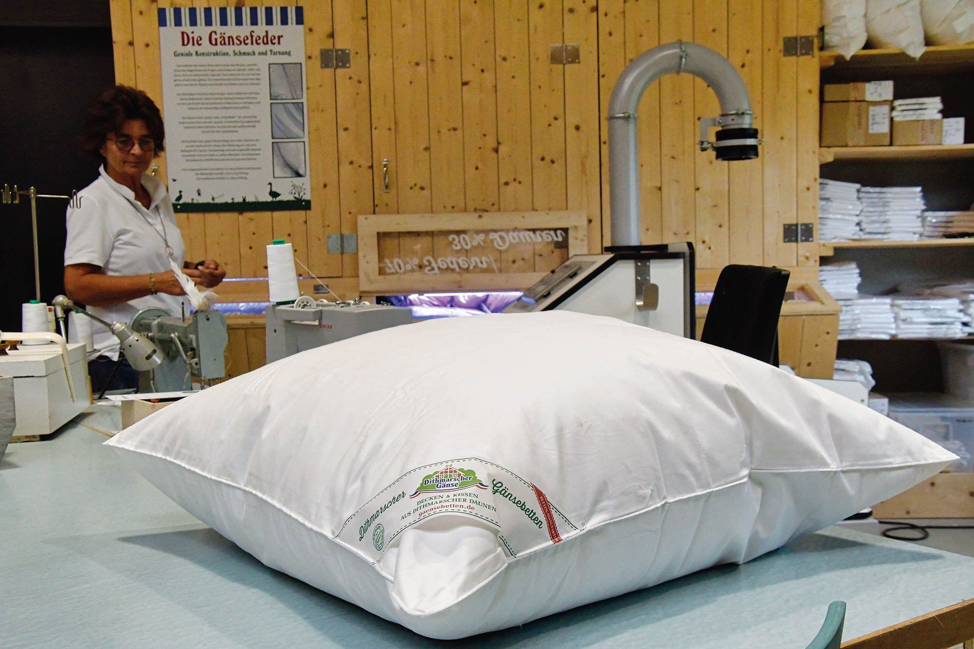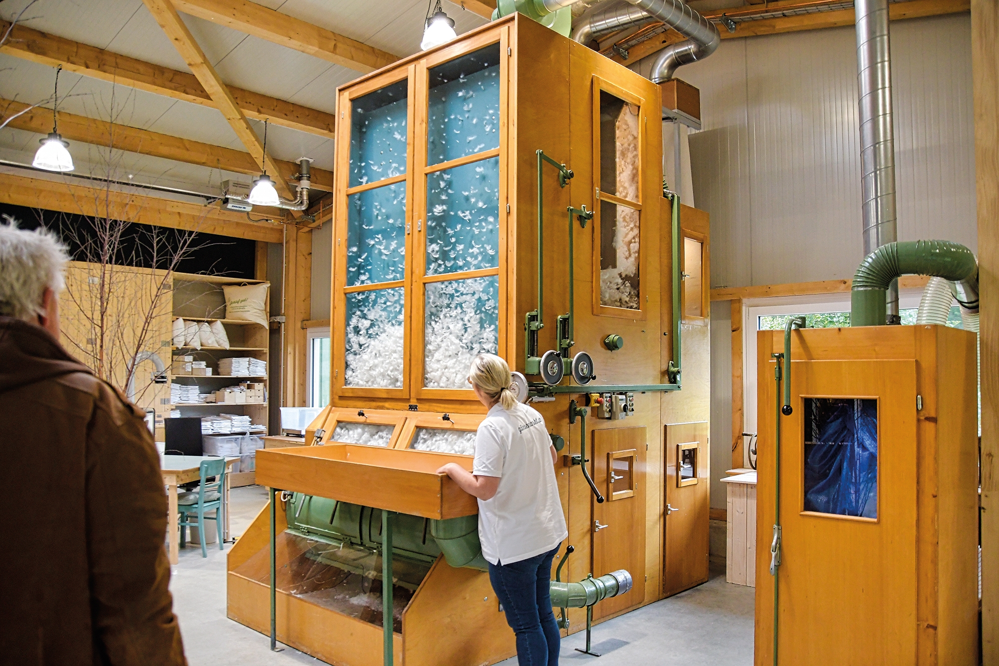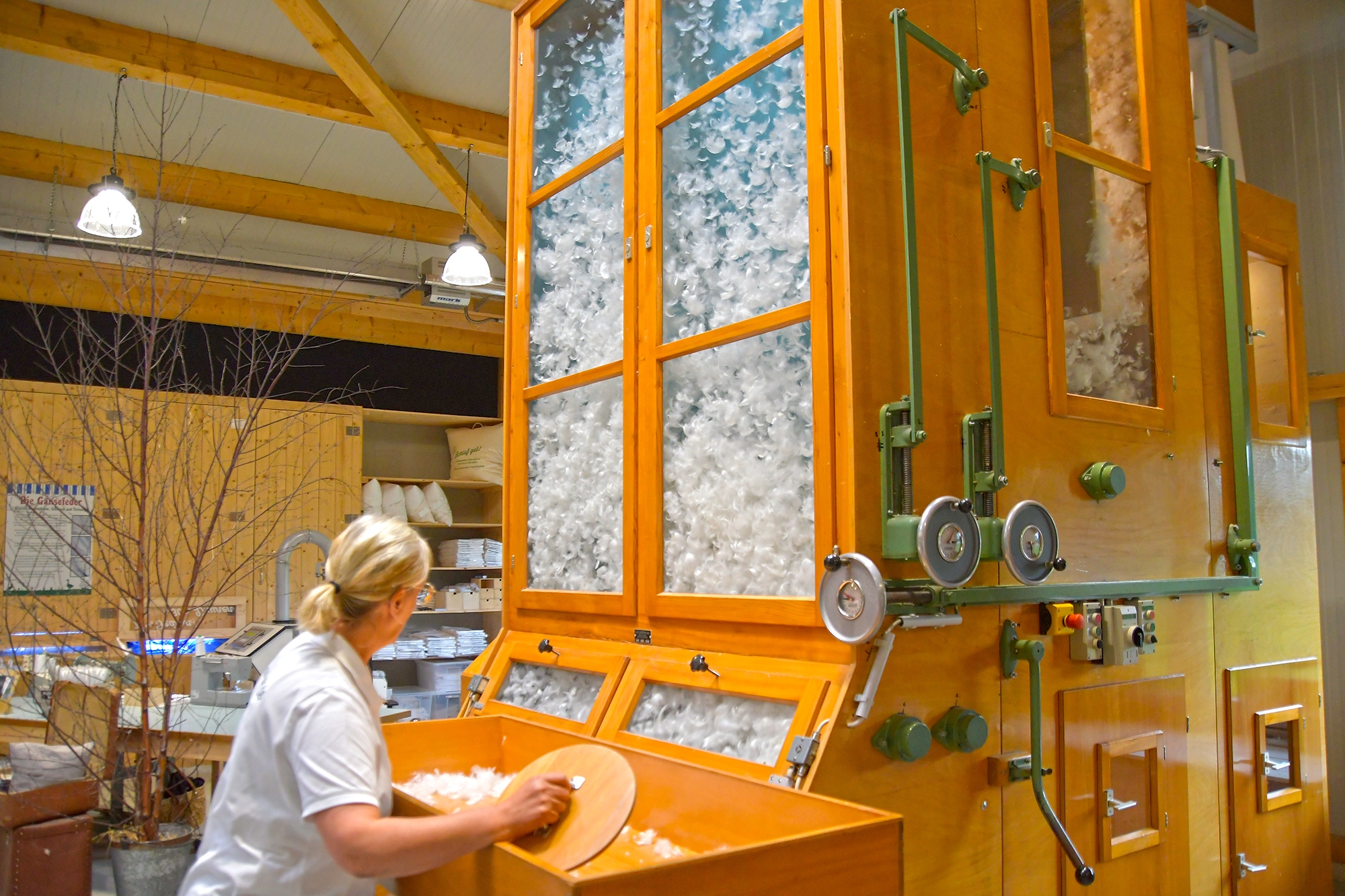 Die fast 4 m hohe Federsortiermaschine trennt dabei sauber Gänsedaunen und -federn, die später in drei Mischqualitäten zum befüllen der Daunenbetten verwendet werden – alles in liebevoller Handarbeit. In der Betten-Manufaktur werden ohne Ausnahme die Daunen und Federn der eigenen Dithmarscher Gänse, die das ganze Jahr über frei auf dem Hof herumlaufen, verwendet.